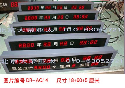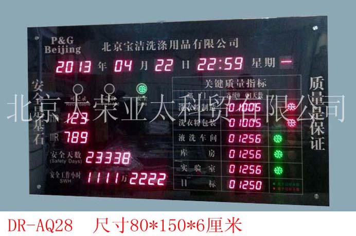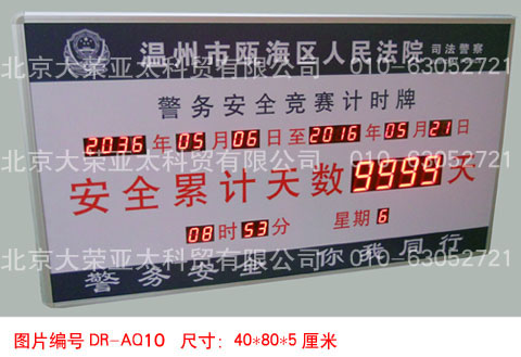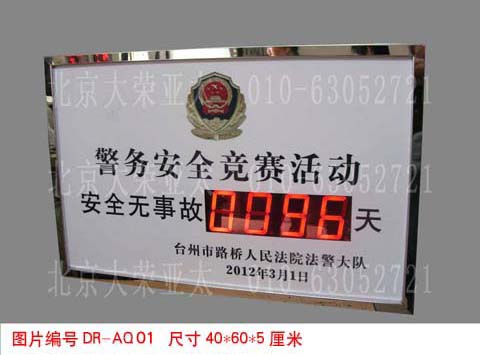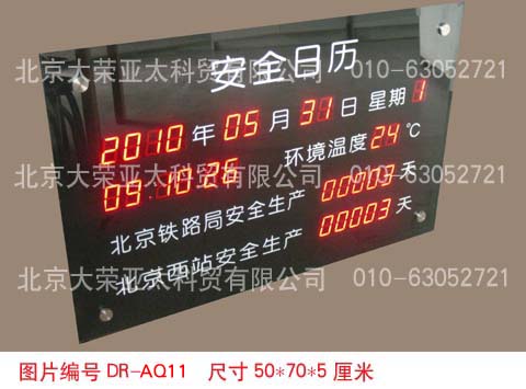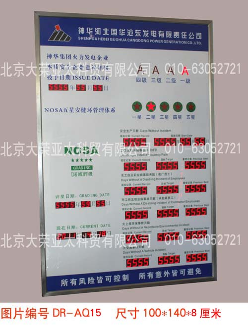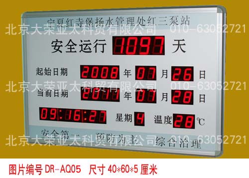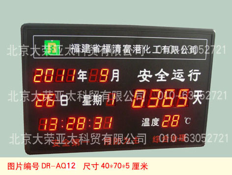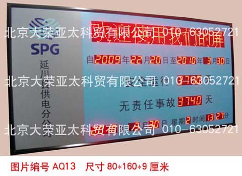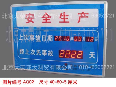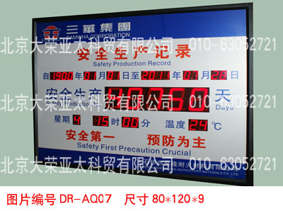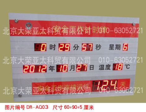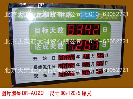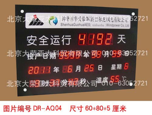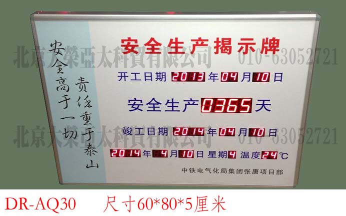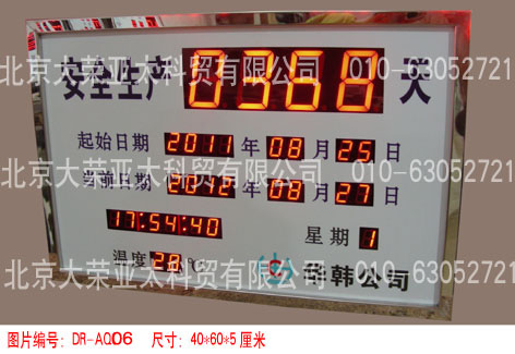 外形尺寸40×60×5厘米,不锈钢边框,亚克力附写真面板,数码管字高3英寸和1英寸,显示内容分为:4位安全天数、起始时间、当前时间、现场环境温度。